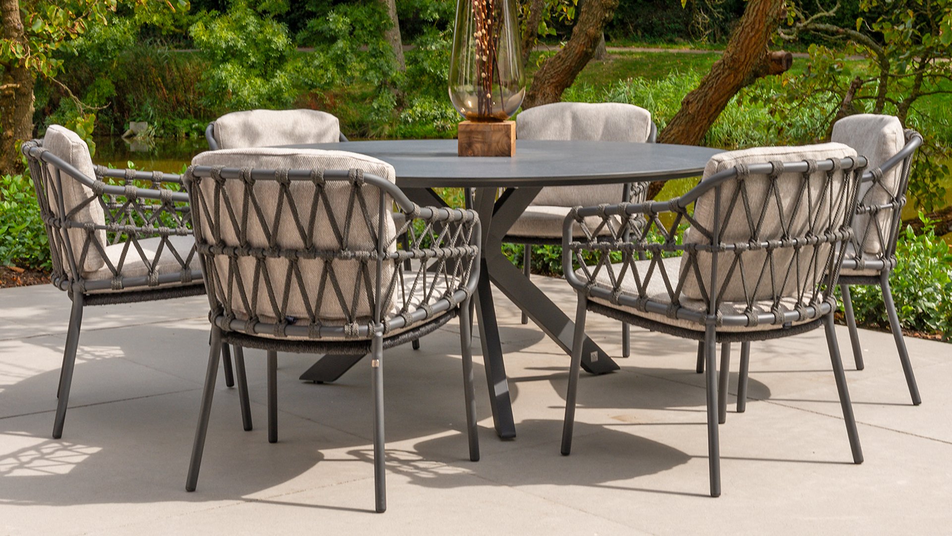 Das auffällige Kreuzfußgestell ist aus pulverbeschichtetem Aluminium gefertigt, was es korrosionsbeständig und langlebig macht.