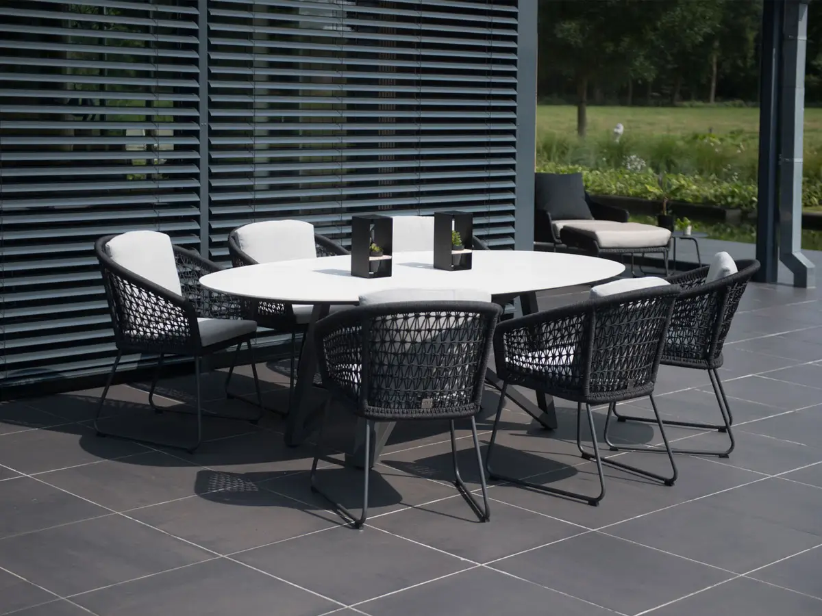 Mila ist ein eleganter und komfortabler Outdoor Dining Stuhl, der sich durch sein Geflecht aus künstlerisch verknotetem Rope auszeichnet. Er wird mit farblich abgestimmten, wetterfesten Sitz- und Rückenkissen für optimalen Komfort und Kontrast geliefert. Das zarte Edelstahl Gestell in Anthrazit rundet die elegante Optik zusätzlich ab.