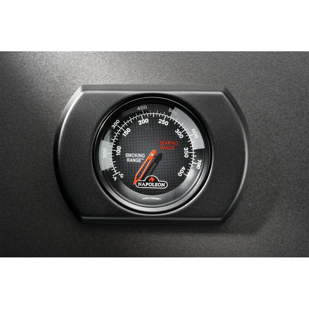 Napoleon Phantom™ Rogue® PRO-S 425: Eleganter schwarzer Gasgrill mit 4 blau beleuchteten Knöpfen, Seitenablagen, Messgerät und Ablagefach.